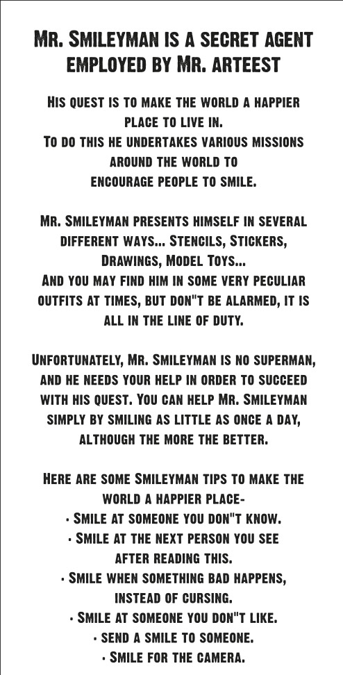 Mr. Smileyman is a secret agent employed by Mr. Arteest.